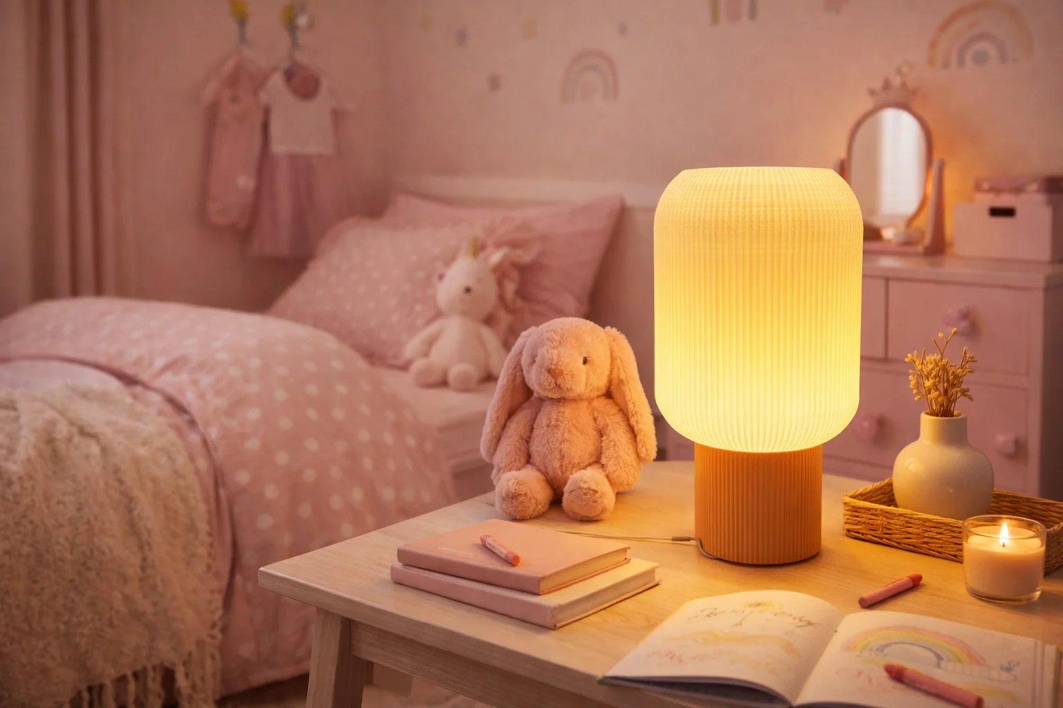 Лаконичное основание и цельная форма делают лампу выразительным, но ненавязчивым акцентом — она одинаково органично смотрится в спальне, гостиной или детской комнате. Лампа создаёт не просто освещение, а настроение: спокойное, тёплое и по-настоящему домашнее.